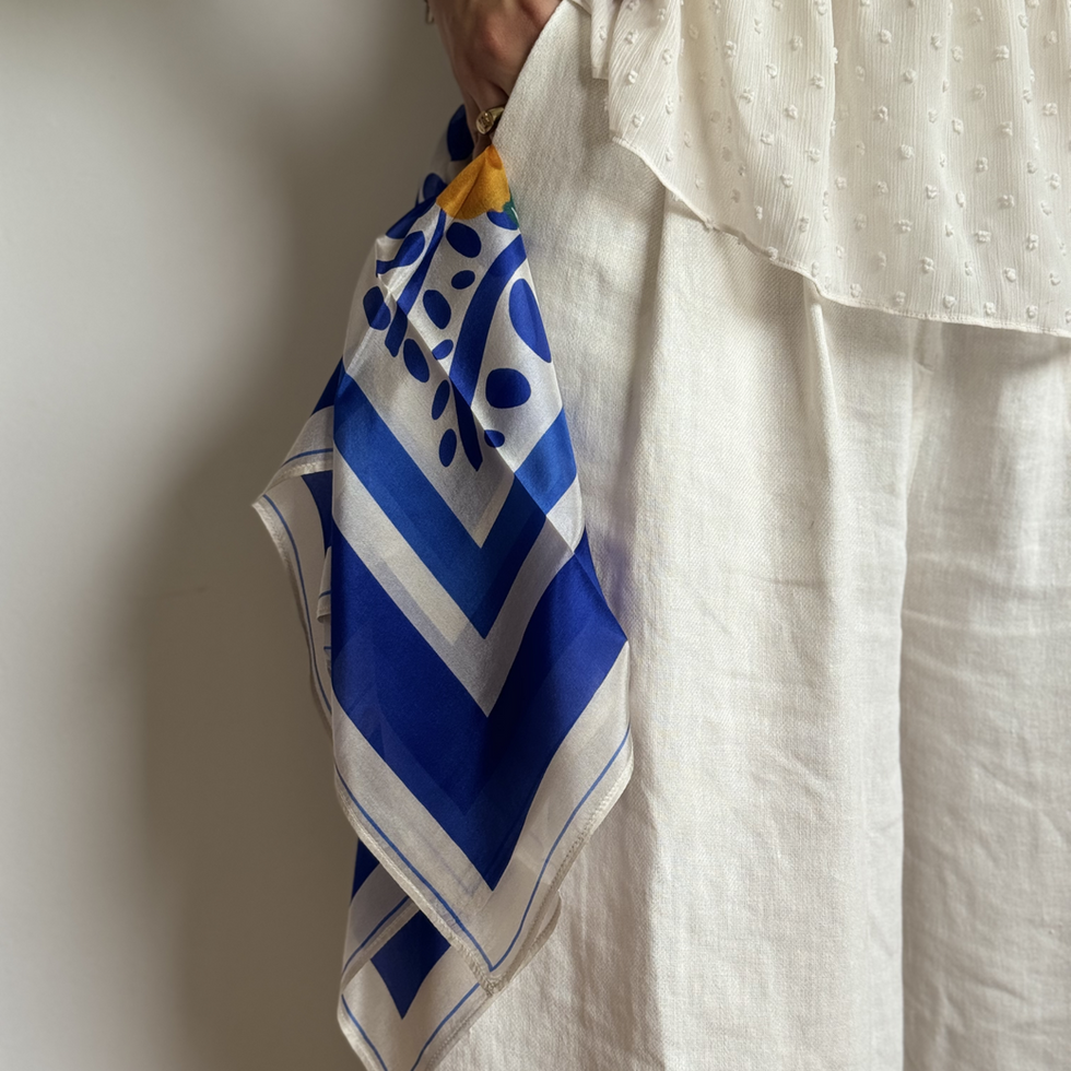 Una mascada de 100% seda natural con un diseño ilustrado a mano de edición limitada.